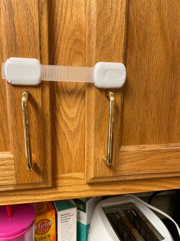 The Skyla Homes baby locks were the ones I found to be easier for me. They come in a pack of 8 or 12 and attach with 3M adhesive flexible straps. You can adjust the strap between 3-7 inches before attaching it to your cabinet. If you are anything like me, it takes a little bit of practice to get your fingers to work with the lock. Once you get it though, the locks work wonderfully! You can watch my video demonstration here.