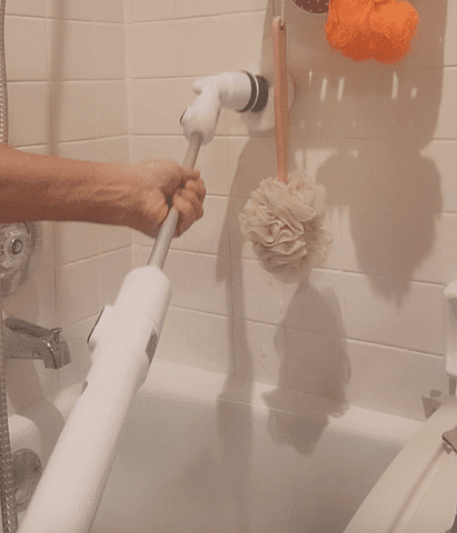 Image: White Turbo Scrub power scrubber extended over a tub cleaning a white tile shower wall