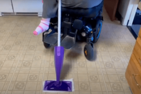 Image: A purple Swiffer wet jet mop being used from a power chair to clean a linoleum floor