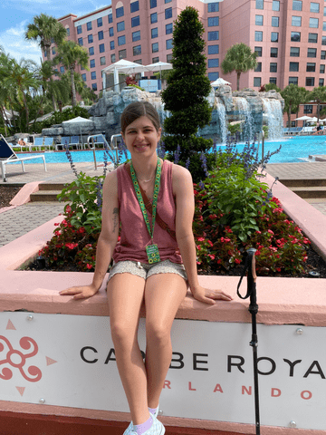Image: Ellie, a young woman with brown hair, sitting outside a hotel in Orlando by the pool. She is wearing a sunflower lanyard and has a walking stick beside her.