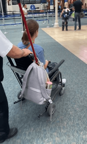 Image: Ellie is seated in a transport chair with her book bag hanging from the back. She is being pushed by a staff member toward airport security.