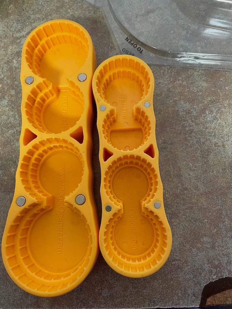 This one comes from Amazon. I really like this one. It is so easy to use. It even works with minimal hand strength. Mine comes in a set of 2. In the package there is a plus size as well as a mini size. I really like the mini-sized one. I can take it with me if I need to go somewhere. For either size, I use the Magic Opener that works best for whatever size bottle I need opened. I set the opener firmly on top, and twist.