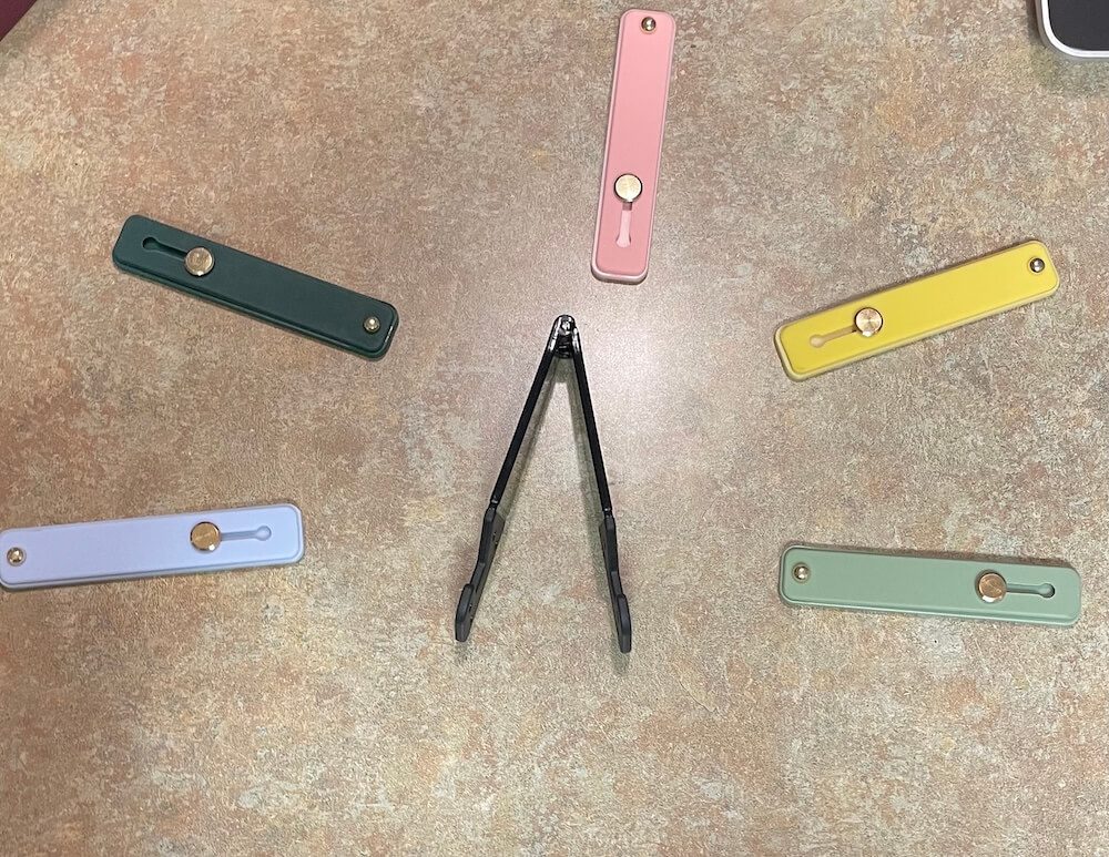 It took a while, but I finally found the Weewooday 6-piece phone grip holder strap. This strap sticks on the back of your smartphone or tablet, as long as the devices are 4-8 inches long. I have had my strap on my phone since February 2022 (6+ months), and it is still holding very well. You separate the two straps. The top strap is going to be stiff at first, so slide it back and forth a few times. You can then insert 2 fingers and hang on to your device that way. The product even comes with a nifty little kickstand to hold your phone up [may or may not be included!]. All in all, the phone grip holder works wonderfully for what I need!