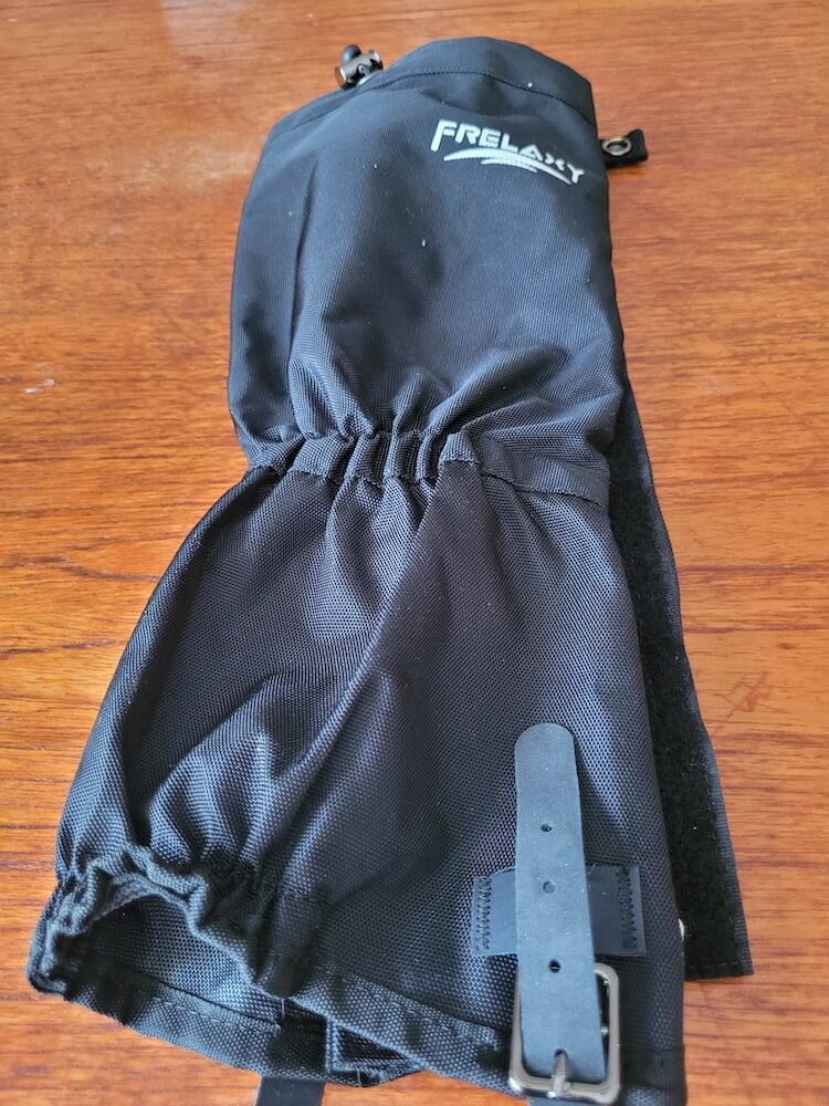 Video description: Lisa demonstrates wearing the black leg gaiters, which cover her lower legs to just below the knees, and how to put them on. They have a velcro closure up the front.