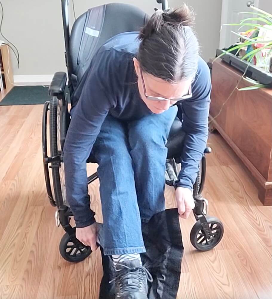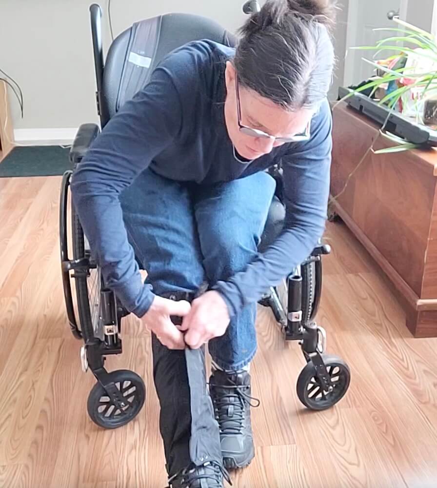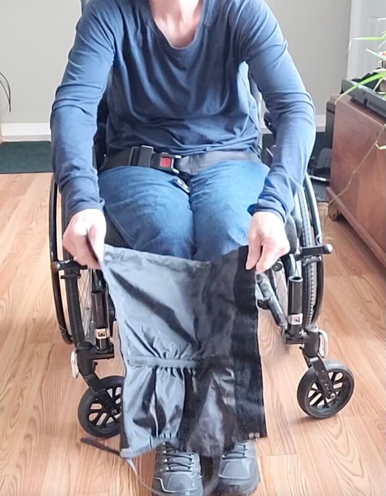 When using her wheelchair, Lisa finds that there is often a gap between her shoe or boot and pant leg, which can leave her leg exposed to cold or wet weather. This winter, she tried to change that with leg gaiters.