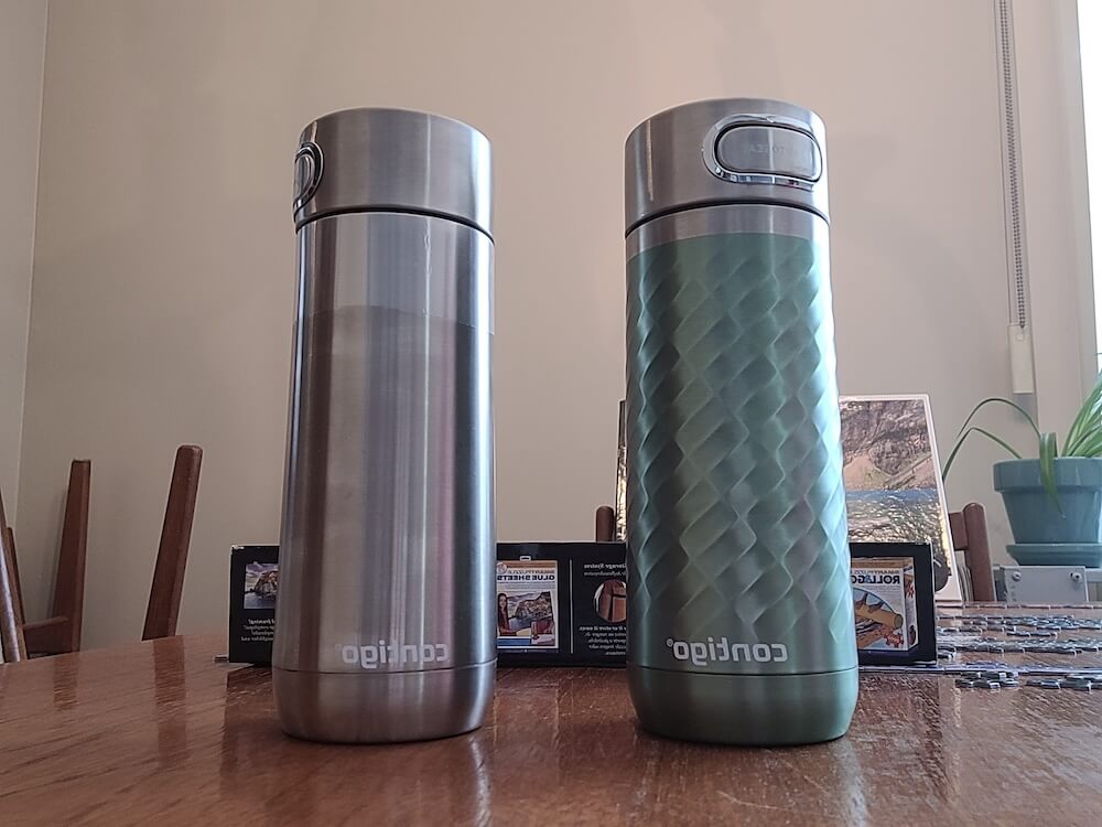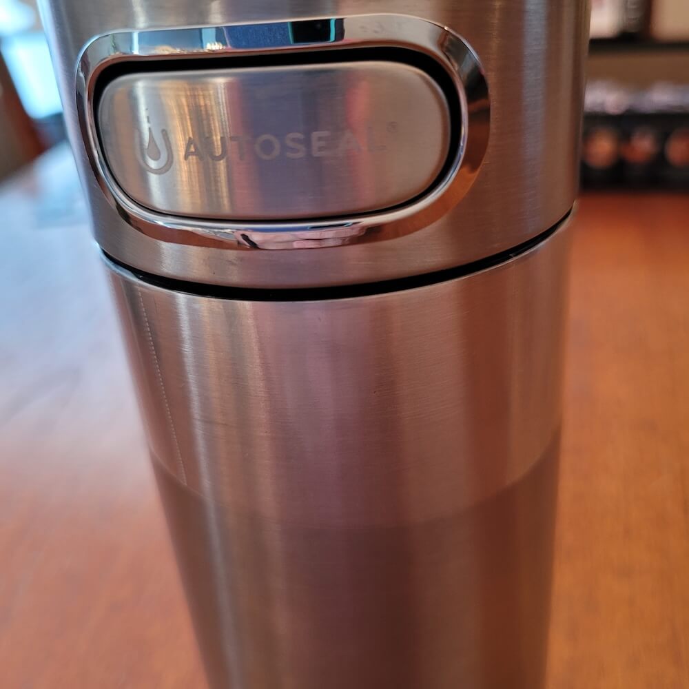 The Contigo Luxe Autoseal Mug (16 oz.) has a button that needs to be pushed to open the valve for drinking. It is designed to be leak- and spill-proof, and also features a “lock” button to secure the bottle in cases where the button might be accidentally pushed. It is dishwasher safe (although this is not recommended for all colors).