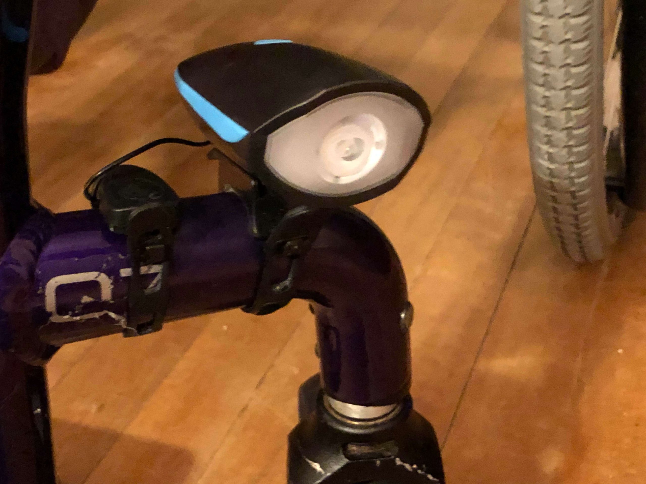 I still use this, but the silicone strap snapped, rendering it useless on the front of my wheelchair, but I found that it had another use—strapped to the back of my wheelchair for my partner to illuminate the walkway at night. So I still like it, although the usefulness of this product for its intended purpose has changed. This bike light & horn holds a charge like none other! I only have to fully charge the light once every two months for light to moderate use. And if you don’t want the noise, you can do what I eventually did after accidentally touching the horn button one too many times—just take scissors to the wire between the light and the button. Let there be (only) light! The stretchy silicone strap was resilient but likely snapped for two reasons: the extreme change in temperature (sometimes below zero outside, then 60-70s inside), and the fact that I frequently rotated the light on my wheelchair depending on my needs. I rotated it straight ahead to illuminate the path while traversing a distance, and I rotated it down when navigating through the house so as not to disturb others. Because it is an adjustable strap with holes, it will fit on the smaller bar on the back of my wheelchair, but the hole on the strap snapped where I would need it to fit on the larger bar on the front of my wheelchair.