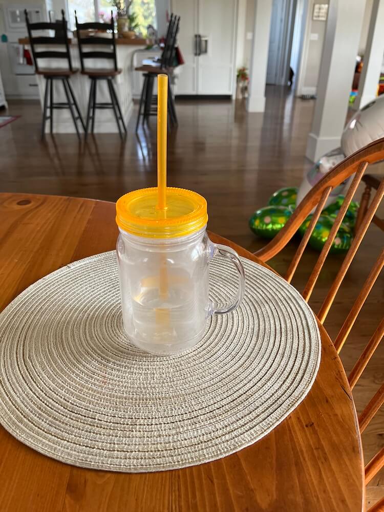 Jen finds that a cup with a handle, lid, and straw (and a bit of color!) is her go-to choice right now. The handle is key to a better grasp, and the fact that it’s plastic makes it very durable.
