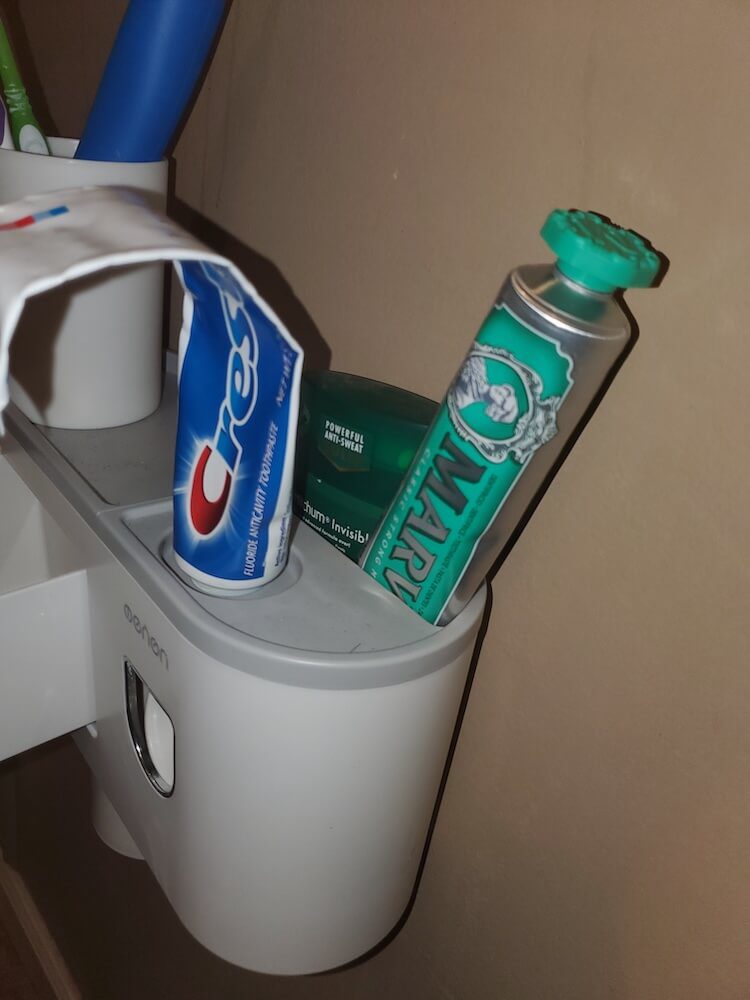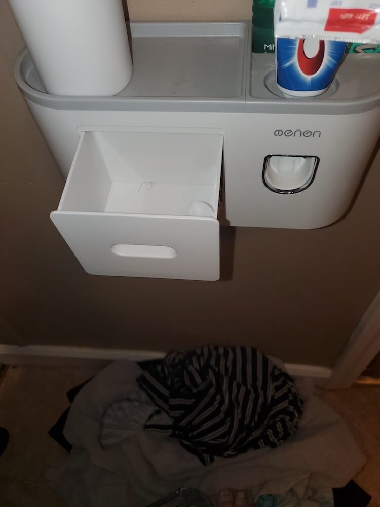 This toothbrush dispenser is so cool! Store toothbrushes, toothpaste, floss, makeup and more! There are spots underneath for cups, holders for FOUR brushes, a drawer and a space up top for whatever you want. That is all bonus to the purpose: a very easy toothpaste dispenser. Put your toothbrush in the hole, push the lever to add toothpaste to your brush and VOILA you’re ready! Struggle to put toothpaste on your brush? Need more counter space? This is so easy to use! You can put it on any height on your wall, there’s no damage and you create your own access! Ericka also noted that the holder does seem strong enough to hold an electric toothbrush!