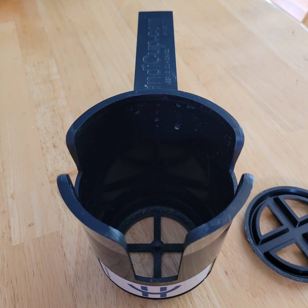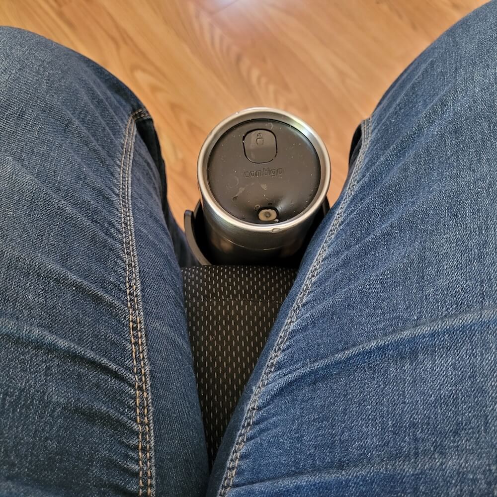 I don’t use this anymore. Yes, it probably still works well. But I didn’t like the fact that it was sticking up between my legs and made transferring a little bit difficult. And now I have a designated water bottle and a designated Contigo coffee mug that both work perfectly for me.