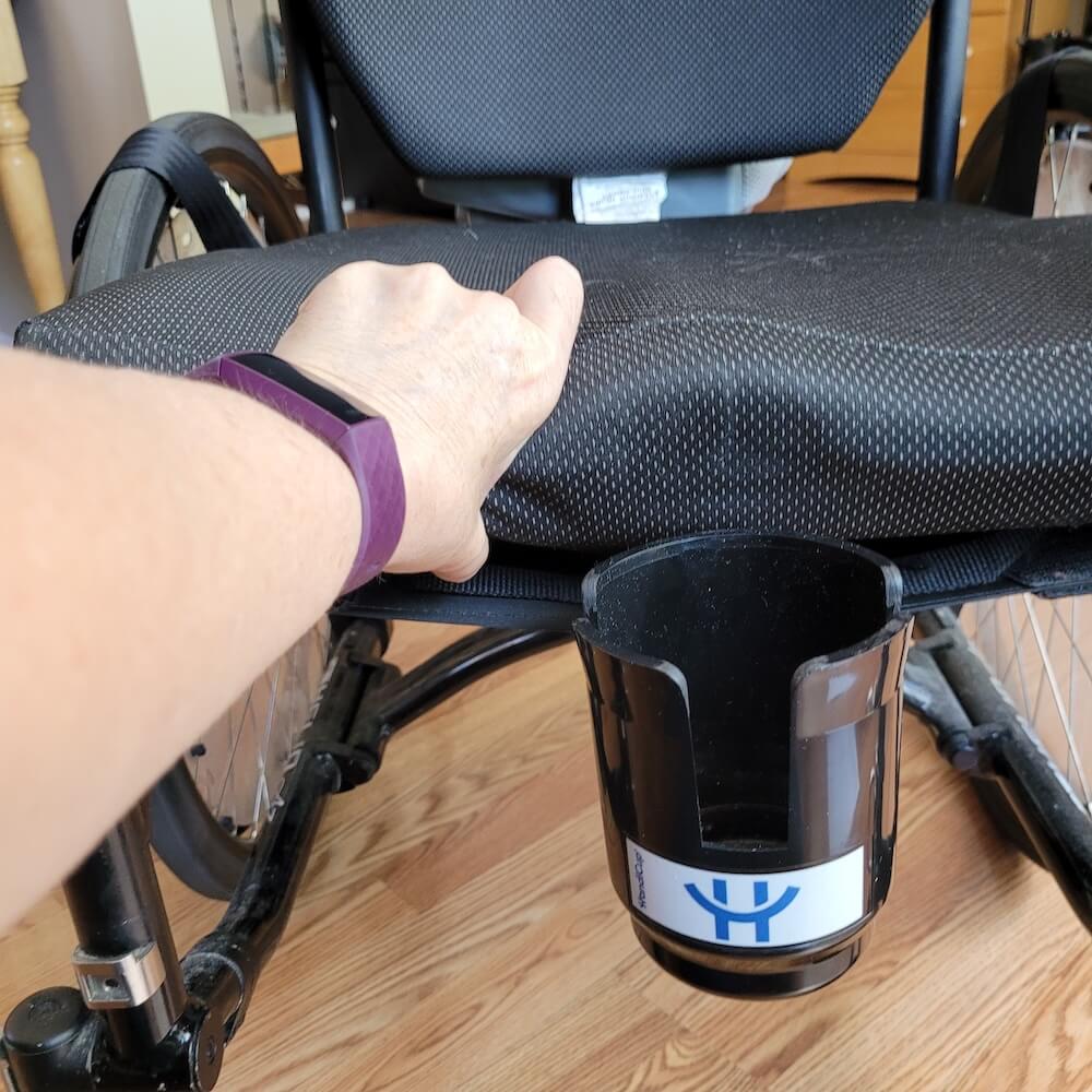 I stopped using this cup holder because I found it difficult to get into my wheelchair with it on. I just realized I could probably have gotten into my wheelchair and then put the cup holder in there, but it also feels weird and chafed me inside of my legs a little bit by having something right there.